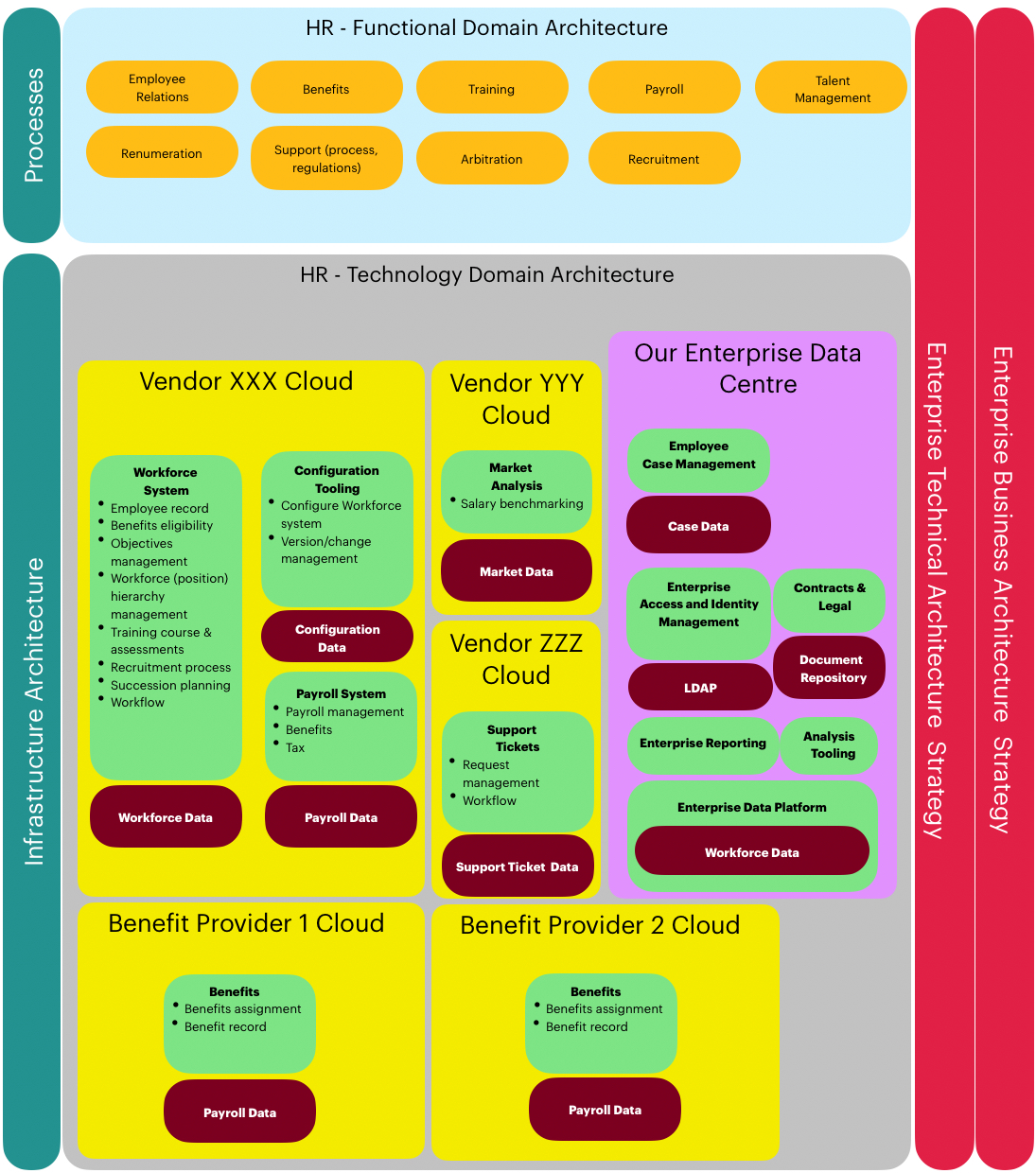 It is common to describe this architecture in functional domains, as defined in the functional architecture. Taking the HR functional domain as an example, we may present the following technology architecture. In this exercise we will assume some standards and principles are observed by the enterprise and solution architects: